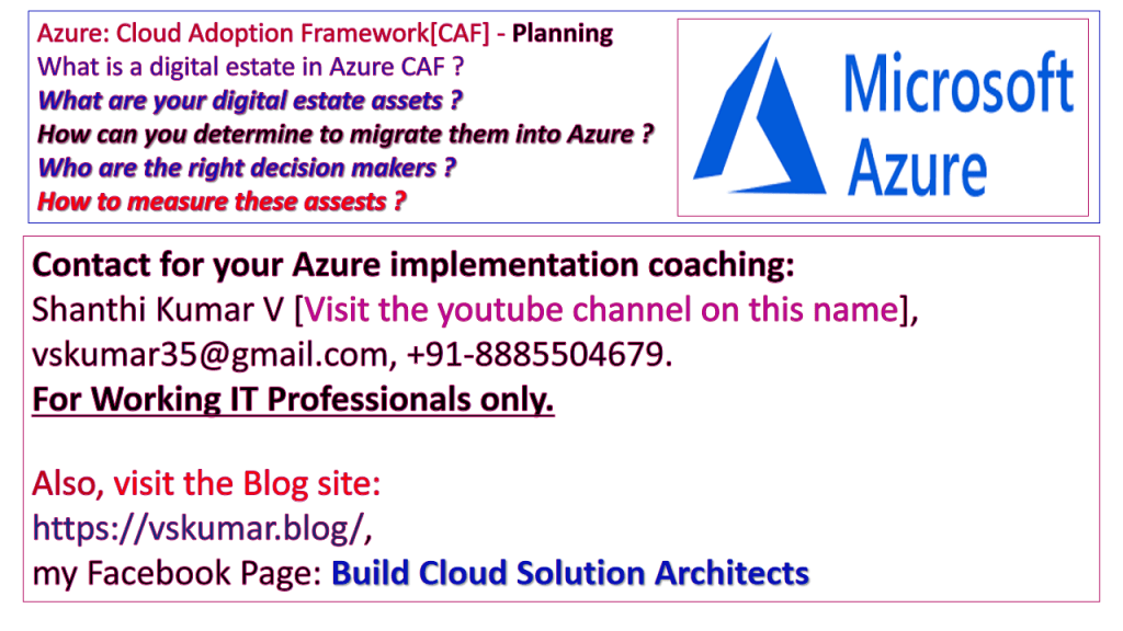 Every Cloud Services vendor designed a Cloud Adoption Framework [CAF]. Through this framework, one can plan/design/implement the Cloud Migration successfully, when they do the right identification for Digital estate assets. For CAF blog/video please look into the links given in the bottom of this blog.