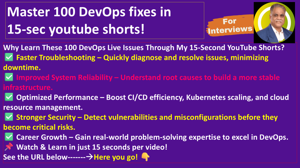 100-Why DevOps Persistent Volume Claims Fail? https://www.youtube.com/shorts/Nr_sT9SJ90c 99-Why DevOps OpenTelemetry Misconfigurations? https://www.youtube.com/shorts/bqlpHoql8EM 98-Why DevOps Edge Deployment Failures? https://www.youtube.com/shorts/csiGHqmMv7A 97-Why DevOps Cross-Region Latency? https://www.youtube.com/shorts/cGW1oVUUR6o 96-Why DevOps Webhook Authentication Issues? https://www.youtube.com/shorts/zf3uzXhtX8k 95-Why DevOps Zero Trust Policy Issues? https://www.youtube.com/shorts/CC1MU4rjy4E 90-Why DevOps Hybrid Cloud Sync Issues? https://www.youtube.com/shorts/Tu8ehFMQXHM 94-Why DevOps Immutable Infrastructure Breaks? https://www.youtube.com/shorts/WflmH-k37ZQ 93-Why DevOps Ephemeral Storage Exhausted? https://www.youtube.com/shorts/0sHrwI-3Qfw 92-Why DevOps Cache Eviction Issues? https://www.youtube.com/shorts/X6bY5WHK1iQ 91-Why DevOps Service Rollout Delays? https://www.youtube.com/shorts/6BR5eAe8wJw 100-Why DevOps Persistent Volume Claims Fail? https://www.youtube.com/shorts/_P8m1Uw-BqE 89-Why DevOps Data Pipeline Breaks? https://www.youtube.com/shorts/DjdsC6cOLQ0 88-Why DevOps Kubernetes Jobs Fail? https://www.youtube.com/shorts/CYsRmIOyHXw 87-Why DevOps Dynamic Configuration Issues? https://www.youtube.com/shorts/8n5modmZ5vo 86-Why DevOps Lambda Cold Start Issues? https://www.youtube.com/shorts/oRedU3heRUM 85-Why DevOps Chaos Engineering Fails? https://www.youtube.com/shorts/zPPf8rARSug 84-Why DevOps Insufficient Observability? https://www.youtube.com/shorts/uZ8H28zUmV8 83-Why DevOps ML Model Deployment Fails? https://www.youtube.com/shorts/Yrp4xklSiis 82-Why DevOps Unpatched Software? https://www.youtube.com/shorts/1zR525ULT3w 81-Why DevOps Poor Alert Correlation? https://www.youtube.com/shorts/H4z1xXzY0-I 80-Why DevOps RBAC Misconfigurations? https://www.youtube.com/shorts/md_1r4wGbpM 79-Why DevOps Multi-Cluster Networking Issues? https://www.youtube.com/shorts/LzJnDnFt-Hg 78-Why DevOps Service Discovery Failures? https://www.youtube.com/shorts/w2pzOL8fuls 77-Why DevOps Distributed Tracing Missing? https://www.youtube.com/shorts/H9fL9Q21BFo 76-Why DevOps Invalid Kubernetes Health Checks? https://www.youtube.com/shorts/RcssnkDT5t4 75-Why DevOps WAF Rules Block Requests? https://www.youtube.com/shorts/cuv9hFu_UK8 74-Why DevOps Cloud Storage Latency? https://www.youtube.com/shorts/mOk1kDles6w 73-Why DevOps SLO Violations? https://www.youtube.com/shorts/AnkhGN43QV0 72-Why DevOps Cloud Misconfigurations? https://www.youtube.com/shorts/xmcDng3ISJE 71-Why DevOps Service Mesh Failures? https://www.youtube.com/shorts/nUJyNb4hQxA 70-Why DevOps Misconfigured Load Testing? https://www.youtube.com/shorts/2VIKP_ef64c 69-Why DevOps Hardcoded Credentials? https://www.youtube.com/shorts/crEM1n9vplg 68-Why DevOps Log Storage Costs Increase? https://www.youtube.com/shorts/7evJvtm9Fxw 67-Why DevOps Poor Log Parsing? https://www.youtube.com/shorts/WKG7JFyLREY 66-Why DevOps Third-Party API Downtime? https://www.youtube.com/shorts/iUVyQeYKz0c 65-Why DevOps Webhook Security Flaws? https://www.youtube.com/shorts/TwS6cFsGQqo 64-Why DevOps Webhook Failures? https://www.youtube.com/shorts/bbhfr3mJvmU 63-Why DevOps Pipeline Secrets Exposure? https://www.youtube.com/shorts/YWW6hraZLhM 62-Why DevOps Infrastructure Drift? https://www.youtube.com/shorts/EG9N6Ygm_yk 61-Why DevOps Orchestration Failure? https://www.youtube.com/shorts/4VMAI4XGjY0 60-Why DevOps Edge Computing Issues? https://www.youtube.com/shorts/Zn8IMIp-qXI 59-Why DevOps Cloud Function Fails? https://www.youtube.com/shorts/SaBAA8v2DnM 58-Why DevOps Data Compliance Issues? https://www.youtube.com/shorts/q4ChoE0Y6HM 57-Why DevOps Vulnerability Scans Fail? https://www.youtube.com/shorts/XsCsPQDDfEA 56-Why DevOps Access Logs Missing? https://www.youtube.com/shorts/he8b5dSn1rM 55-Why DevOps Git Merge Conflicts? https://www.youtube.com/shorts/PUDMEMZyf64 54-Why DevOps Container Registry Issues? https://www.youtube.com/shorts/syMJ1OuNOrc 53-Why DevOps IAM Misconfiguration? https://www.youtube.com/shorts/eprgWL2Wm-M 52-Why DevOps Certificate Expiry? https://www.youtube.com/shorts/1mm3yXNyfm4 51-Why DevOps Secrets Mismanagement? https://www.youtube.com/shorts/4Vb9pxf-hNk 50-Why DevOps Cloud Waste Increases? https://www.youtube.com/shorts/Rhmp9vjqCbg 49-Why DevOps API Gateway Overloads? https://www.youtube.com/shorts/4MRhAcJYPZI 48-Why DevOps Database Replication Fails? https://www.youtube.com/shorts/WOLRSzJuc3s 47-Why DevOps DNS Cache Stale? https://www.youtube.com/shorts/CnhlY4JmHIw 46-Why DevOps Self-Healing Fails? https://www.youtube.com/shorts/kcsu7oaQmOg 45-Why DevOps Canary Deployments Fail? https://www.youtube.com/shorts/-5J1dfLsp6Y 44-Why DevOps Cloud Lock-In Risk? https://www.youtube.com/shorts/KGcOQJXRSOQ 43-Why DevOps Audit Logs Missing? https://www.youtube.com/shorts/Ka9fsYqyxqg 42-Why DevOps Kubernetes Scaling Fails? https://www.youtube.com/shorts/3h_qTbVteek 41-Why DevOps Terraform State Fails? https://www.youtube.com/shorts/IJjb2wme1Q4 40-Why DevOps Helm Chart Fails? https://www.youtube.com/shorts/e2ZeixzRoJU 39-Why DevOps Staging Differs from Prod? https://www.youtube.com/shorts/TeSLaLfjVzg 38-Why DevOps CI Jobs Fail? https://www.youtube.com/shorts/YZ7iDKe5J-0 37-Why DevOps Reverse Proxy Issues? https://www.youtube.com/shorts/5JlDsTmAtf0 36-Why DevOps API Rate Limits Fail? https://www.youtube.com/shorts/sae0wD9wh5o 35-Why DevOps Pipeline Bottlenecks? https://www.youtube.com/shorts/836guwiU3Cg 34-Why DevOps Cloud Costs Increase? https://www.youtube.com/shorts/6-wLxzKh-vU 33-Why DevOps Auto-Scaling Fails? https://www.youtube.com/shorts/KeYMJkz4-E4 32-Why DevOps Feature Flags Fail? https://www.youtube.com/shorts/5B5RSI0xZjQ 31-Why DevOps Rollback Fails? https://www.youtube.com/shorts/RcA7pBBPfrs 30-Why DevOps Blue-Green Fails? https://www.youtube.com/shorts/Am-tvR56vgo 29-Why DevOps Database Migration Fails? https://www.youtube.com/shorts/2uCFmcsjfrU 28-Why DevOps CI/CD Secrets Leak? https://www.youtube.com/shorts/L4bbigC6aGY 27