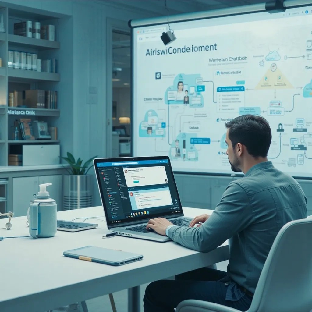 A visual representation could include someone coding in Python-based NLP libraries while testing chatbot interactions in a simulated chat window, accompanied by cloud and database icons to depict deployment and integration.
