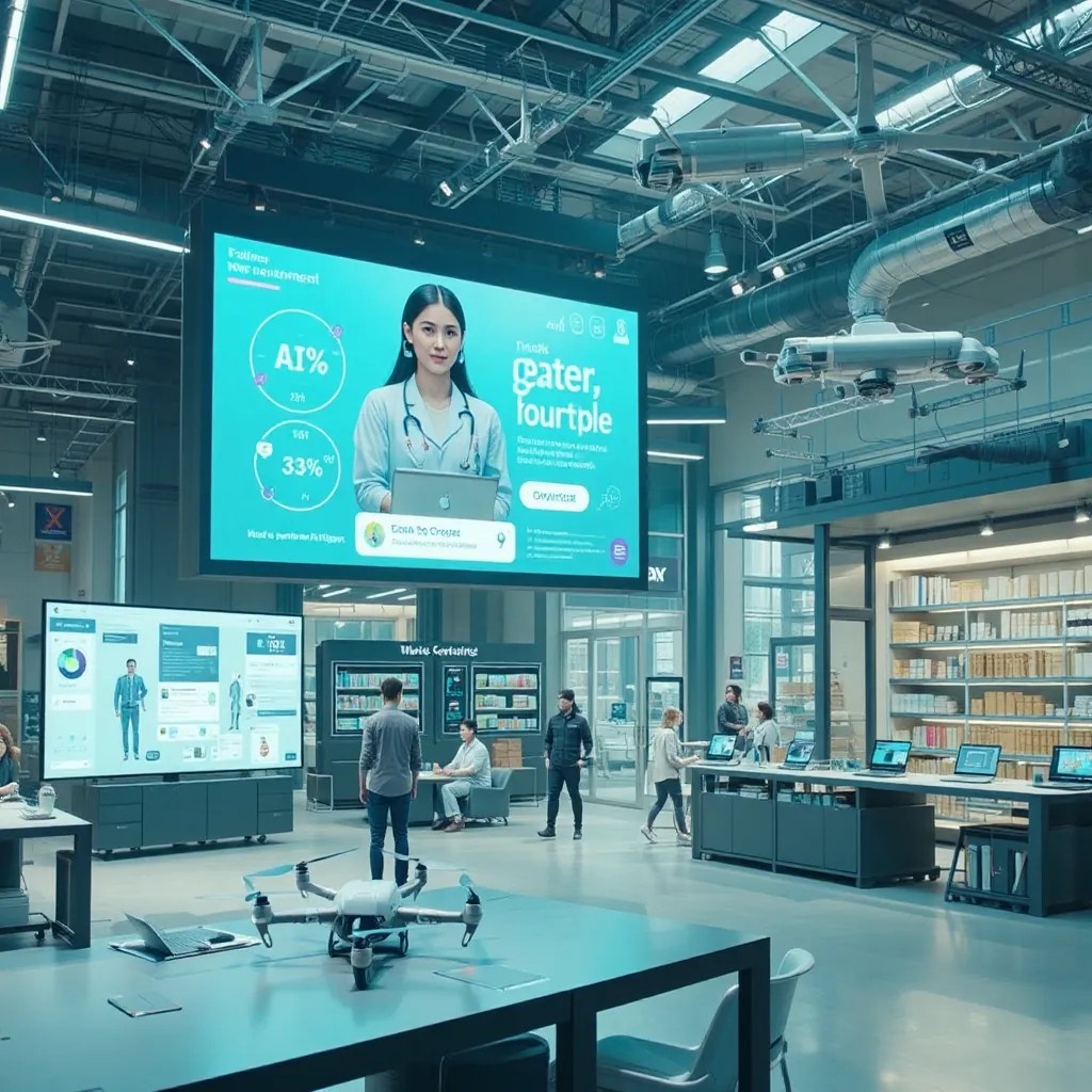 A visual representation could showcase various industries using AI, such as medical diagnostics, virtual assistants, and autonomous logistics systems, interacting with dynamic tools and displays in a futuristic, multi-industry workspace.