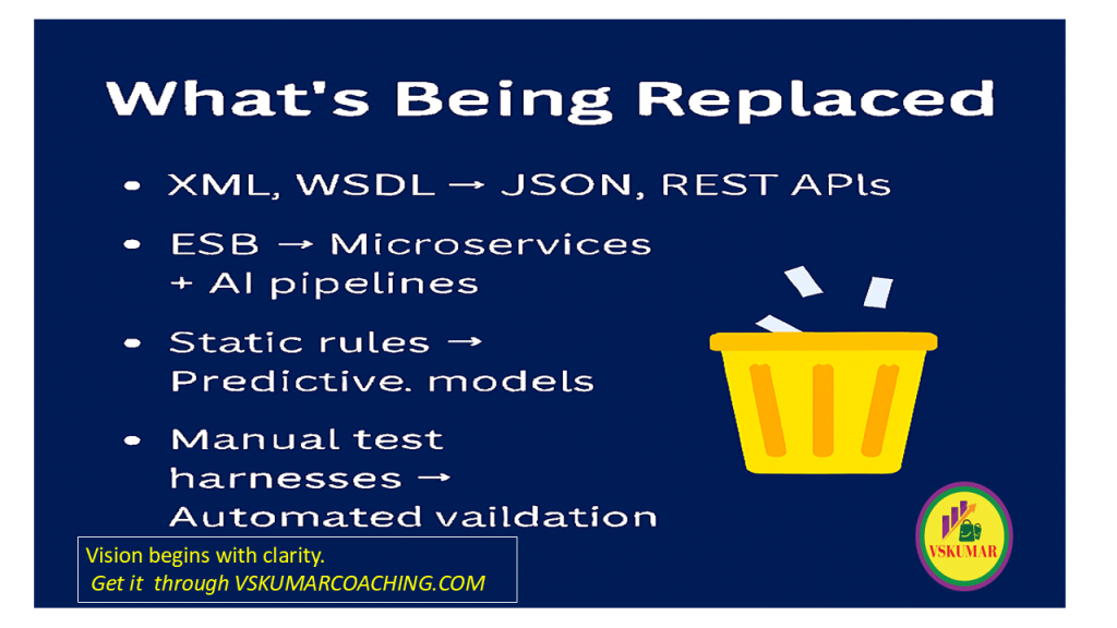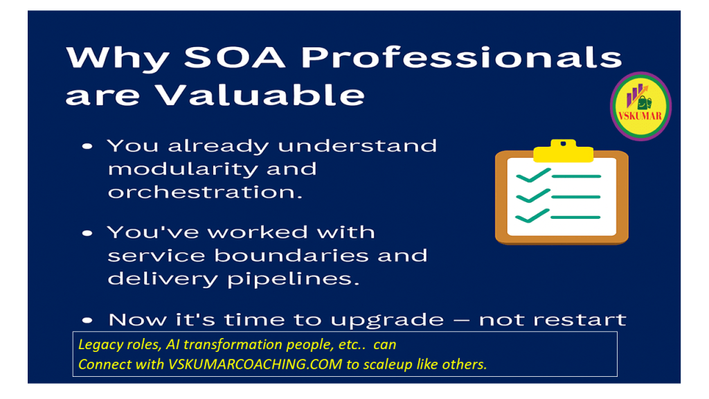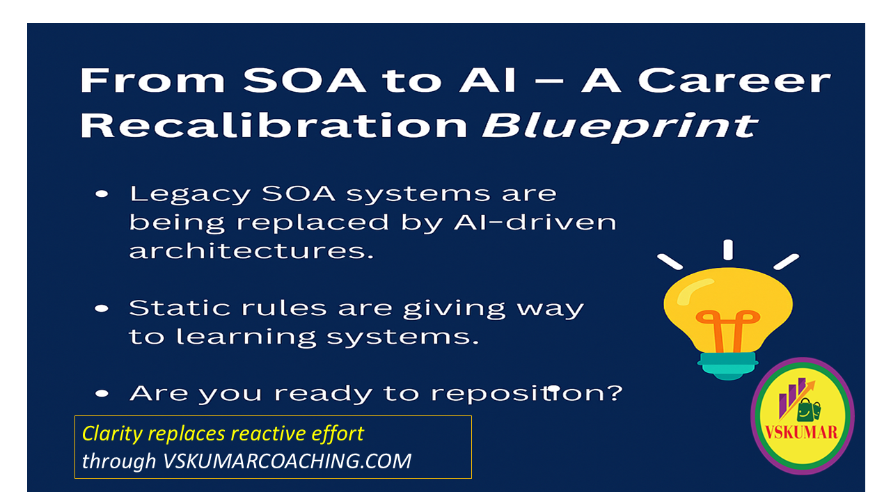 Legacy SOA (Service-Oriented Architecture) systems are being replaced by AI-driven architectures. Static rules are giving way to learning systems. This page outlines a structured transition path for mid-career IT professionals to reposition into AI-aligned roles.